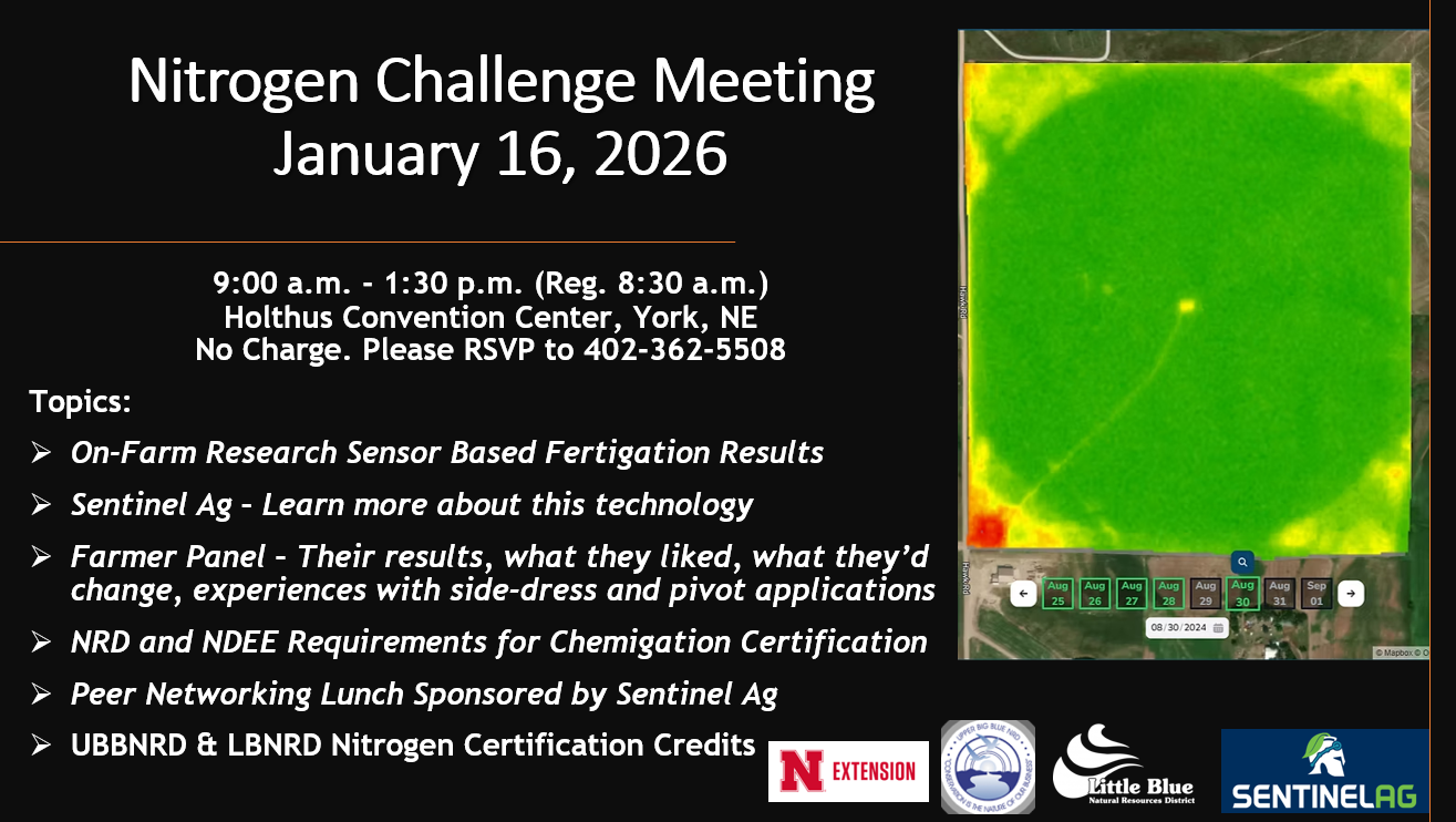 Please note that this event will count toward Recertification for Upper Big Blue NRD's Nitrogen Management Training; however will not meet the requirement for initial training. If attending be sure to sign in with NRD staff at the event sign in table. If you have questions about the event please contact Jenny Brhel, York County Extension at 402-362-5508. If you have questions about NRD Nitrogen Certification, please contact Valerie Paul, Water Conservationist at 402-362-6601.